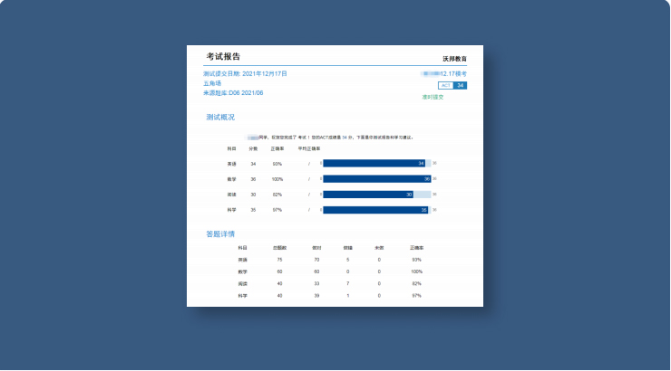 沃邦的個性化入學測評,是一套完善的學習問題診斷系統,能在較短時間內評估出學生現有的閱讀能力、詞匯量、語法知識點、反應能力等。學生接受該測試后,可以從多方面詳細了解自身的英語基礎、學習習慣等狀況。沃邦教育將根據學生的個性特點,制定適合自己的專屬學習方案。